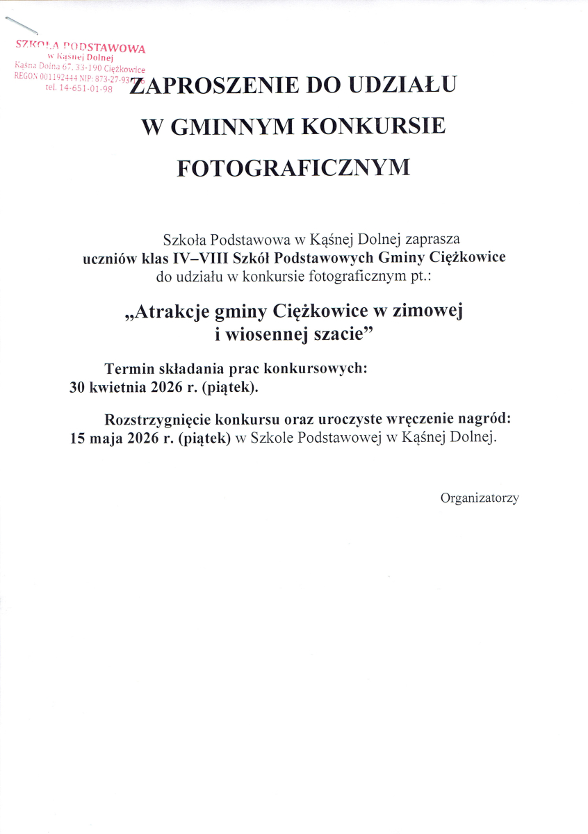 Zachęcamy do wzięcia udziału w konkursie fotograficznym organizowanym przez Szkołę Podstawową w Kąśnej Dolnej.