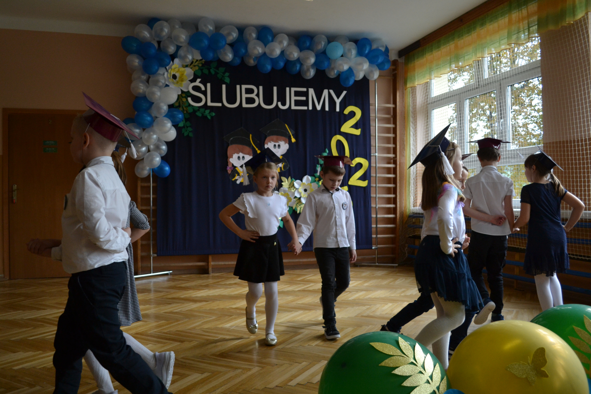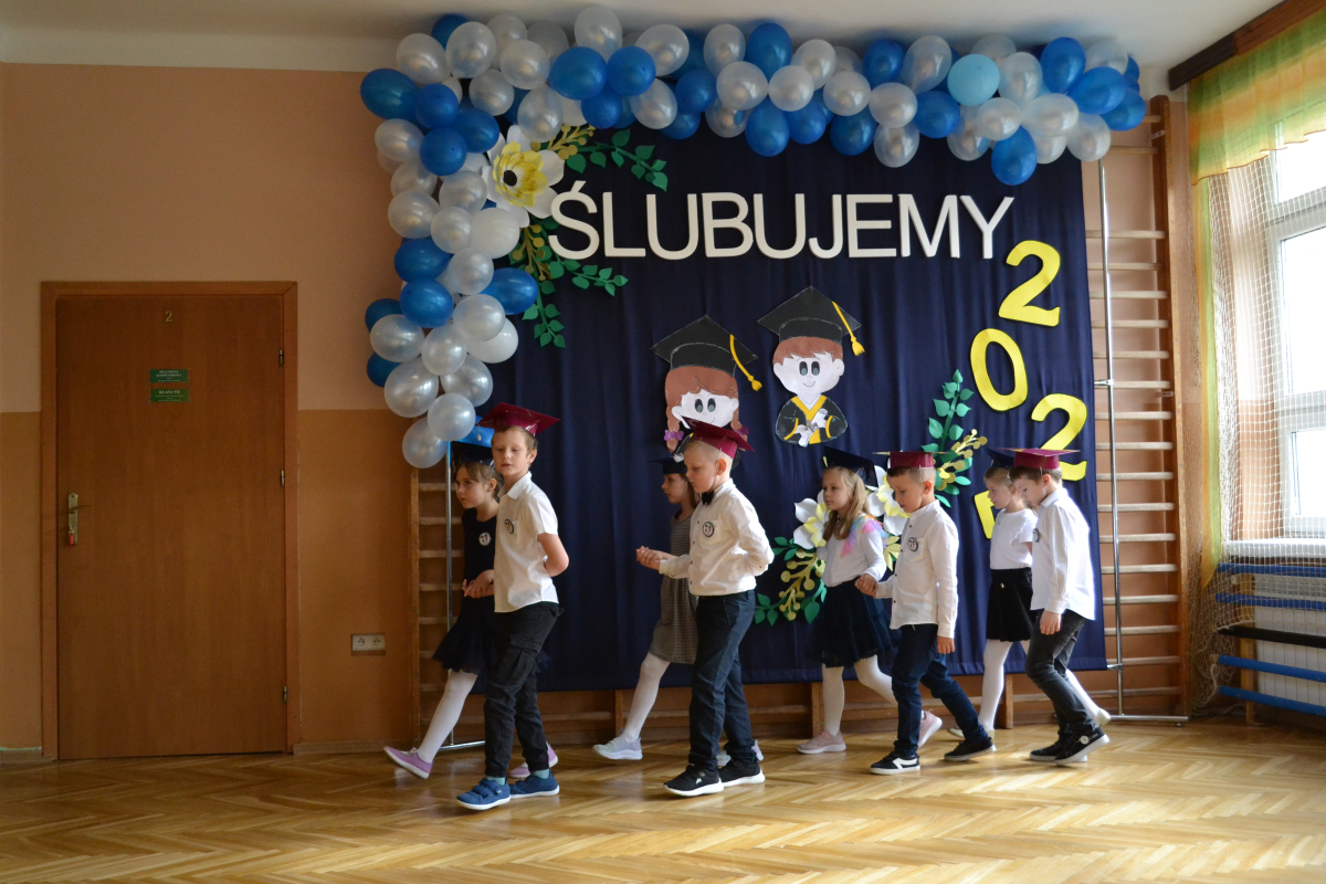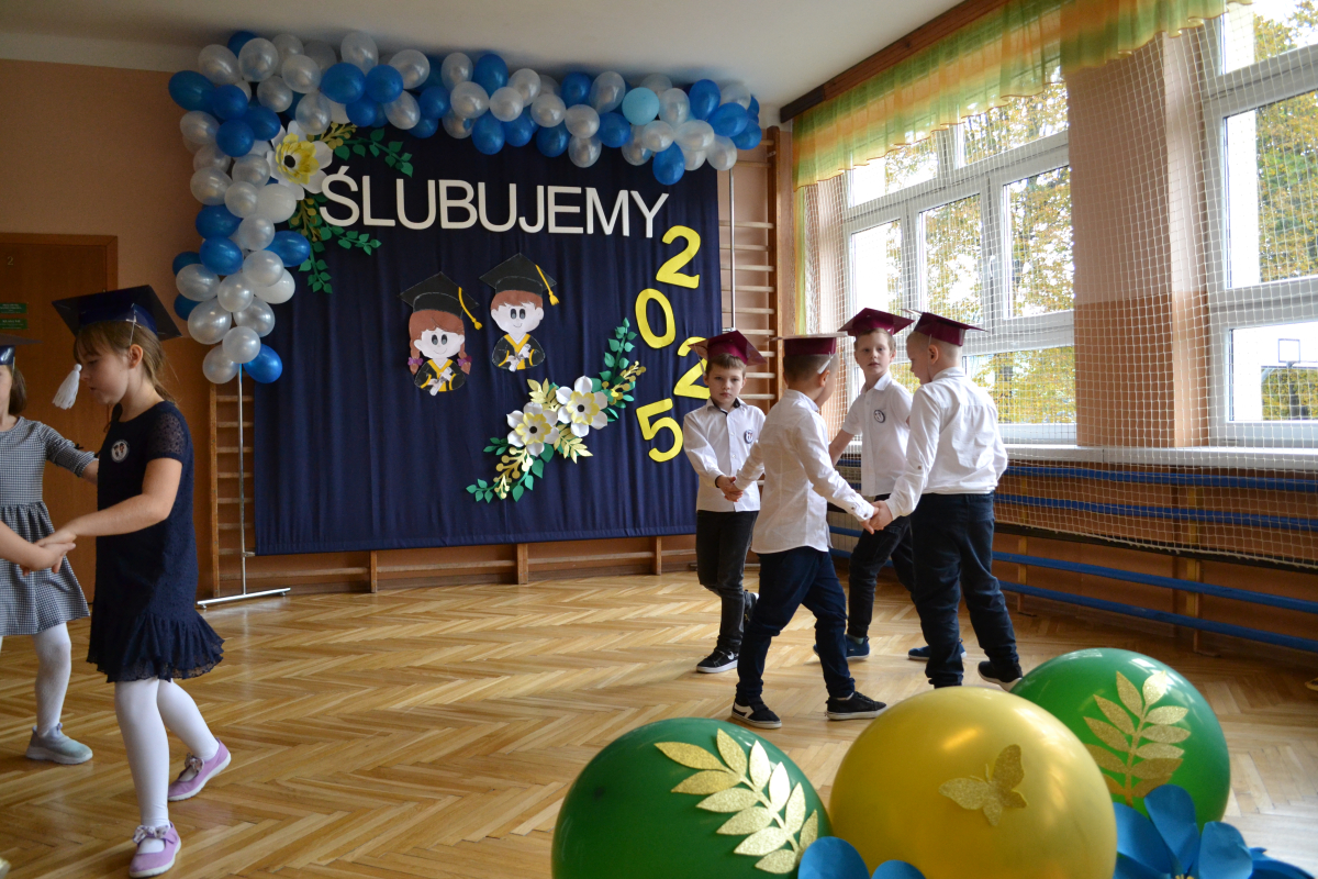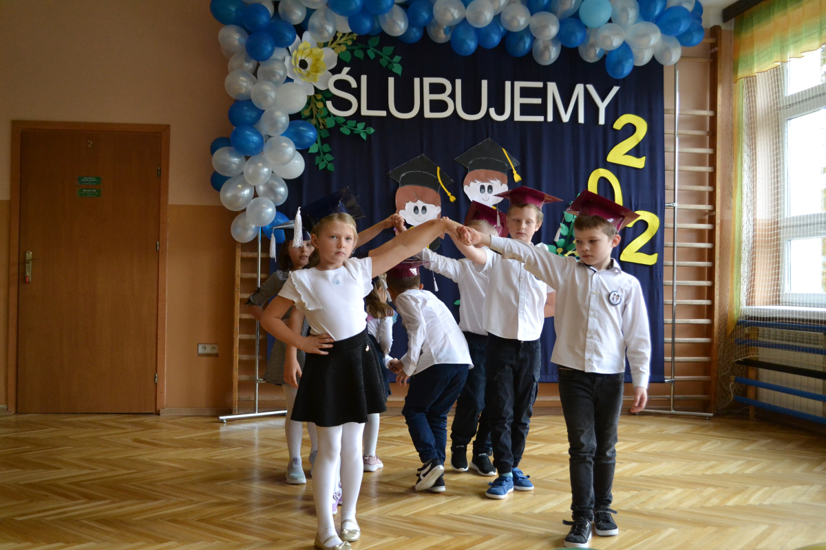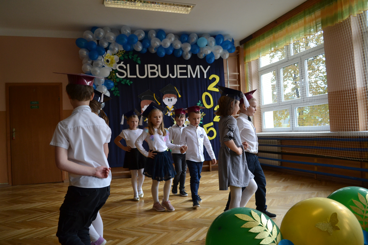Na zakończenie tej części uroczystości uczniowie klasy I, przy akompaniamencie muzyki, zaprezentowali uroczysty taniec – poloneza, który wzbudził ogromne wzruszenie wśród zgromadzonych rodziców, nauczycieli i gości. Później nastąpiła najbardziej oczekiwana chwila – ślubowanie i pasowanie na ucznia, którego dokonał Pan Dyrektor, Stanisław Pater, używając symbolicznego ołówka.
