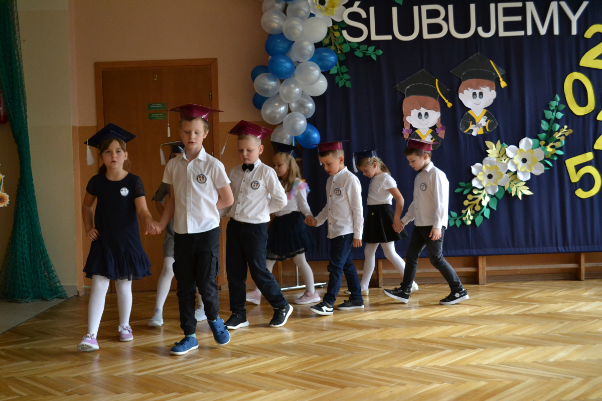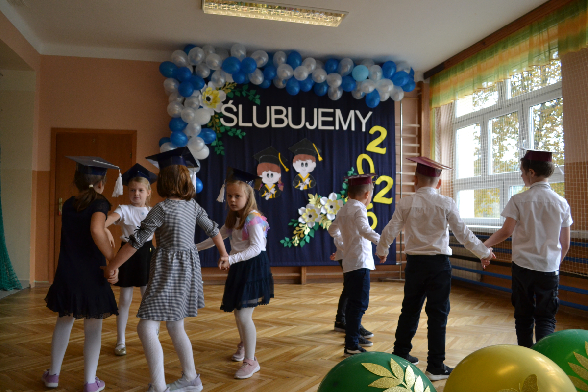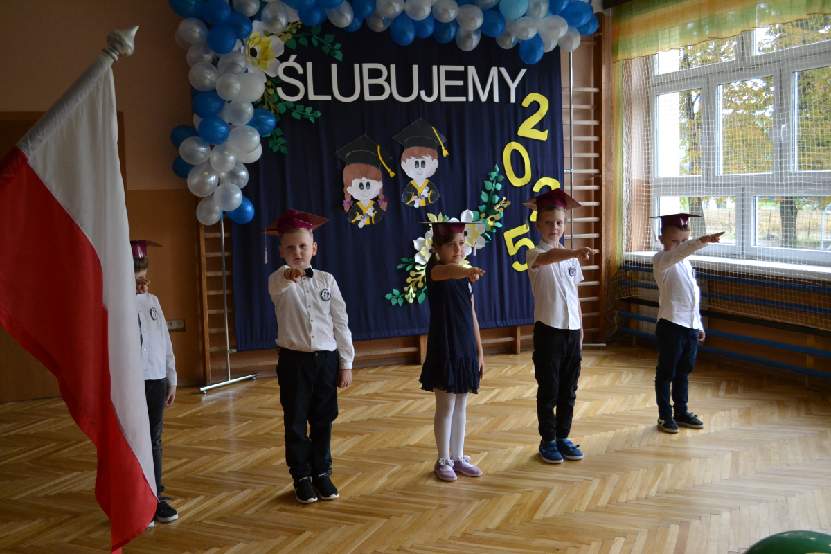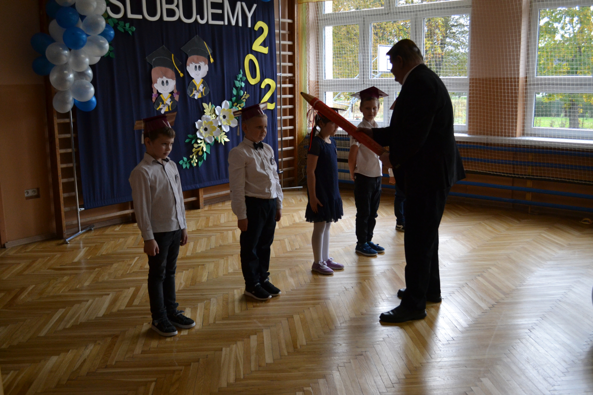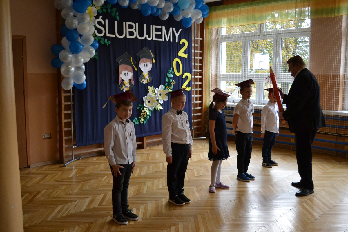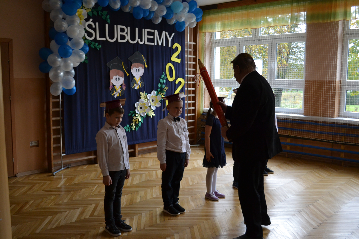 Na zakończenie tej części uroczystości uczniowie klasy I, przy akompaniamencie muzyki, zaprezentowali uroczysty taniec – poloneza, który wzbudził ogromne wzruszenie wśród zgromadzonych rodziców, nauczycieli i gości. Później nastąpiła najbardziej oczekiwana chwila – ślubowanie i pasowanie na ucznia, którego dokonał Pan Dyrektor, Stanisław Pater, używając symbolicznego ołówka.