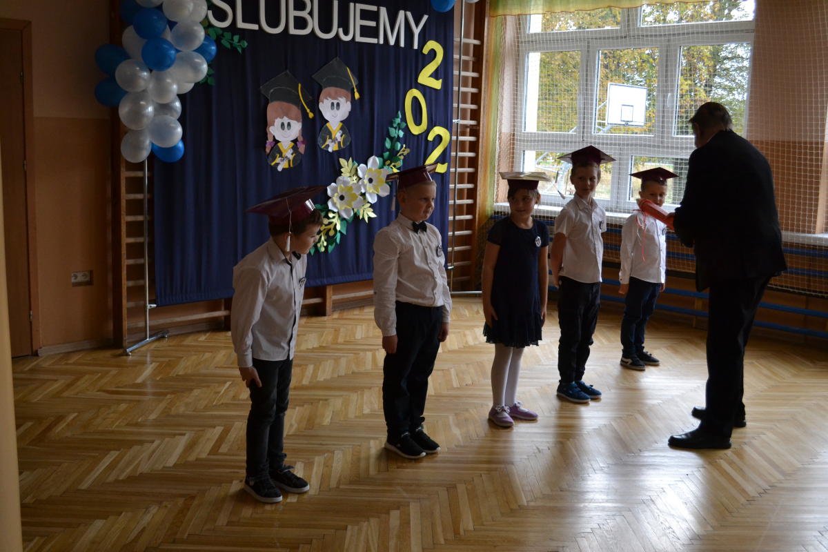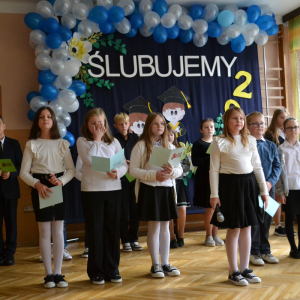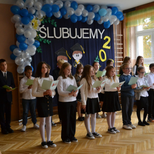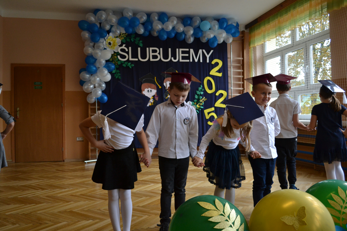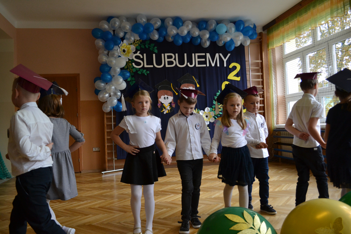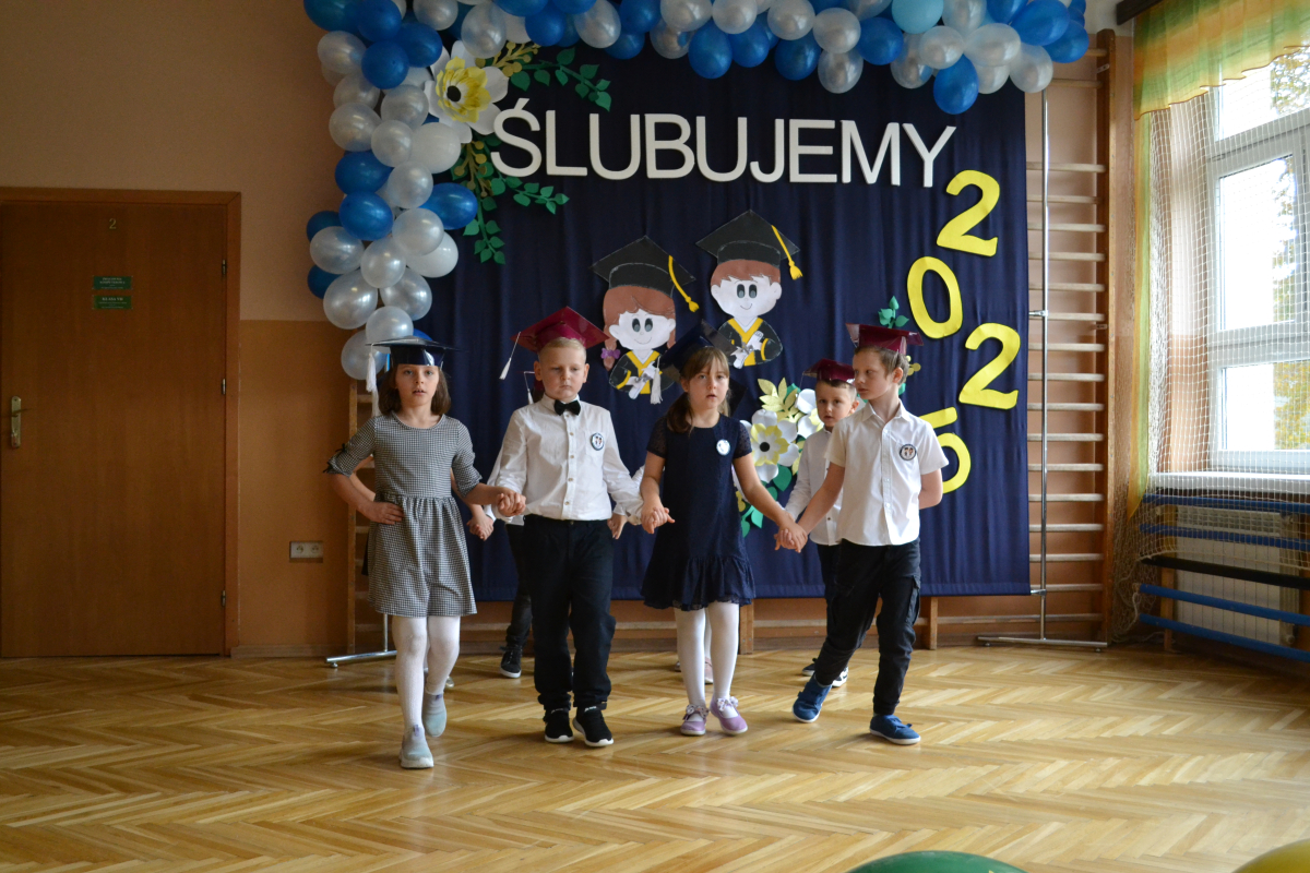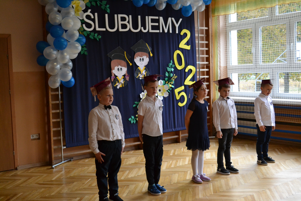 Na zakończenie tej części uroczystości uczniowie klasy I, przy akompaniamencie muzyki, zaprezentowali uroczysty taniec – poloneza, który wzbudził ogromne wzruszenie wśród zgromadzonych rodziców, nauczycieli i gości. Później nastąpiła najbardziej oczekiwana chwila – ślubowanie i pasowanie na ucznia, którego dokonał Pan Dyrektor, Stanisław Pater, używając symbolicznego ołówka.