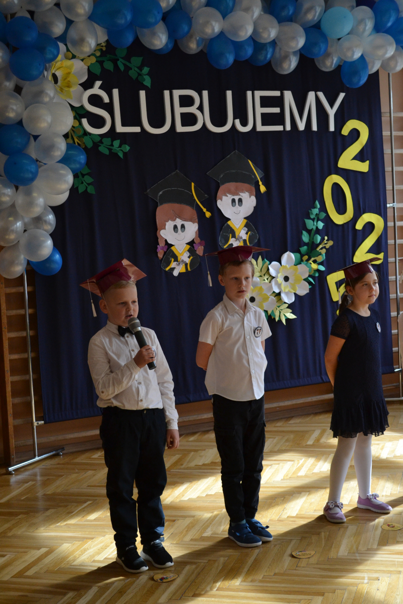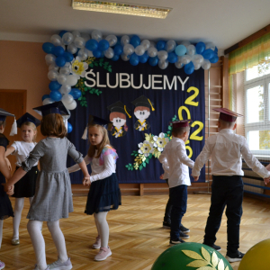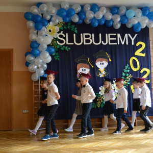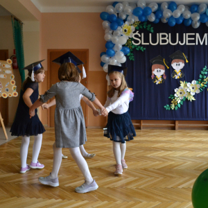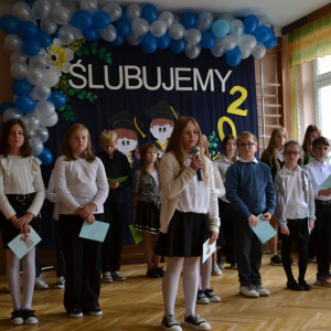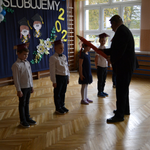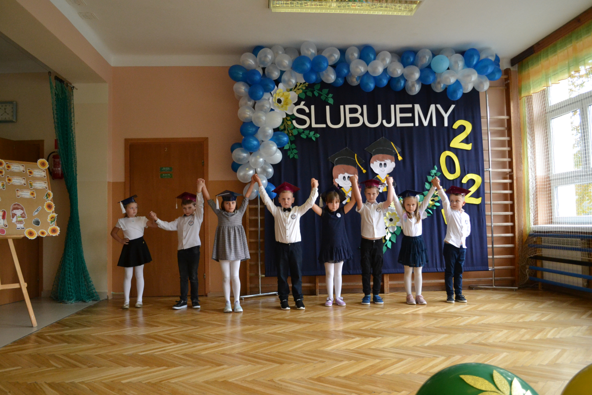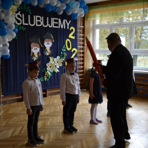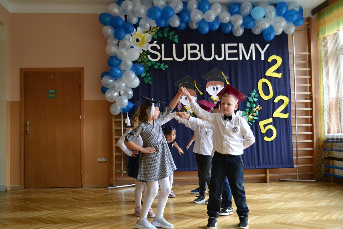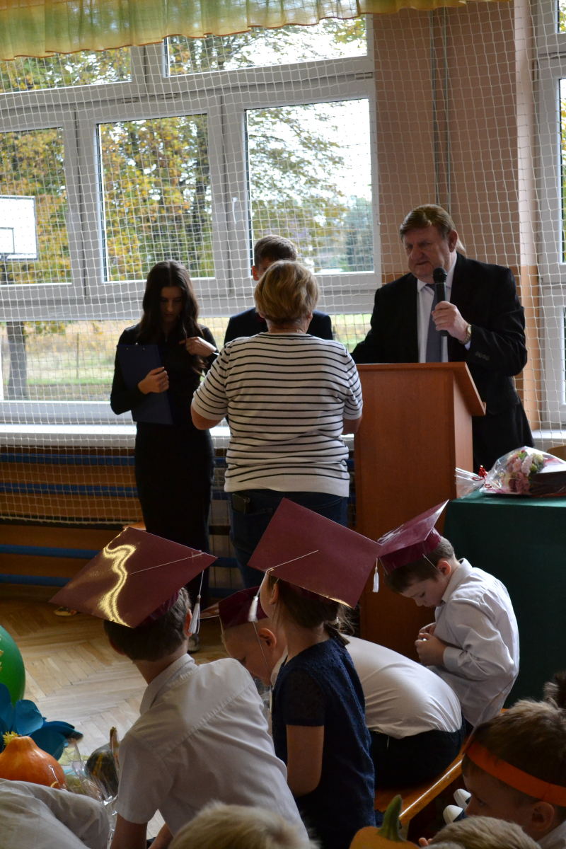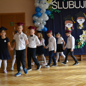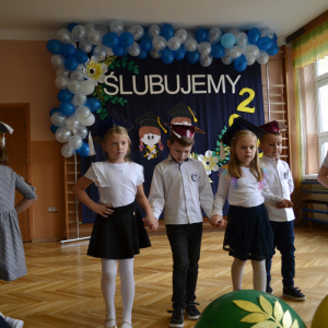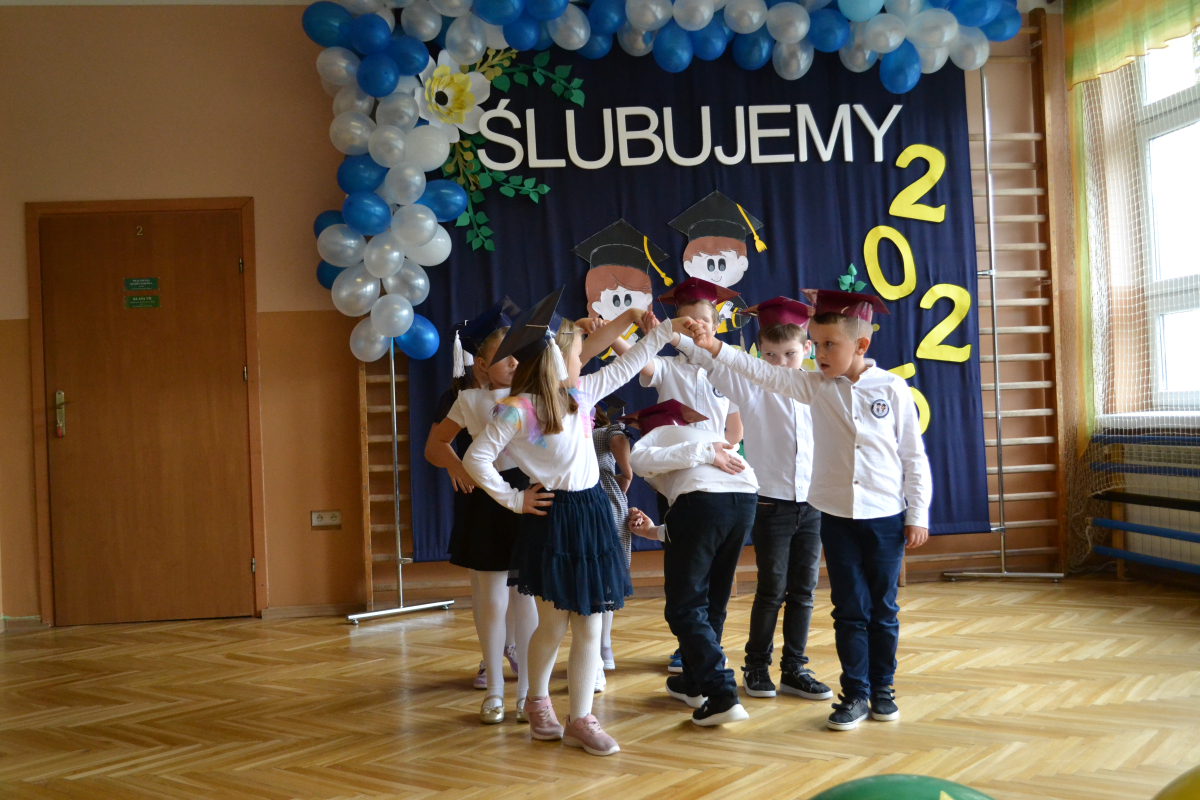 Na zakończenie tej części uroczystości uczniowie klasy I, przy akompaniamencie muzyki, zaprezentowali uroczysty taniec – poloneza, który wzbudził ogromne wzruszenie wśród zgromadzonych rodziców, nauczycieli i gości. Później nastąpiła najbardziej oczekiwana chwila – ślubowanie i pasowanie na ucznia, którego dokonał Pan Dyrektor, Stanisław Pater, używając symbolicznego ołówka.