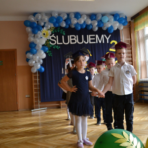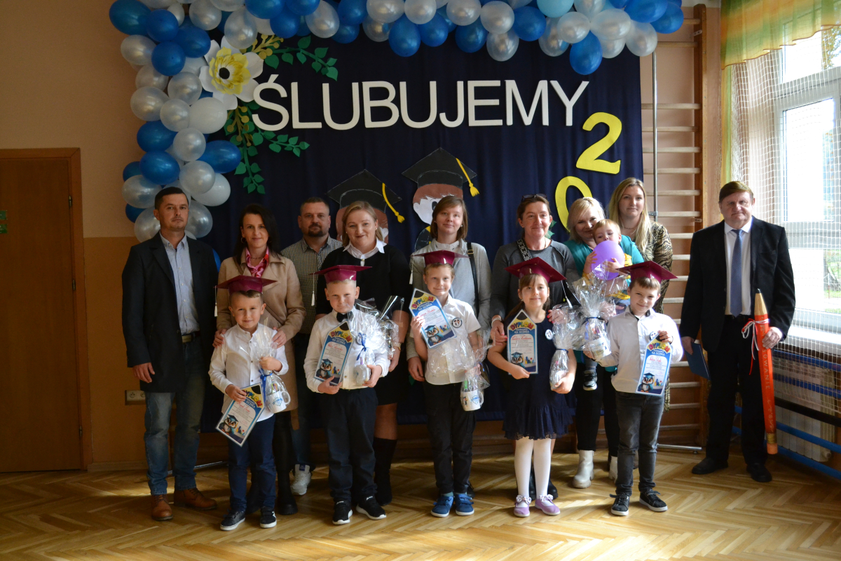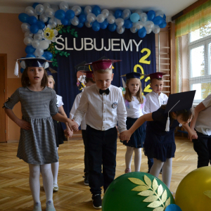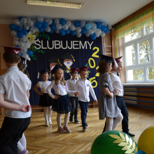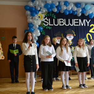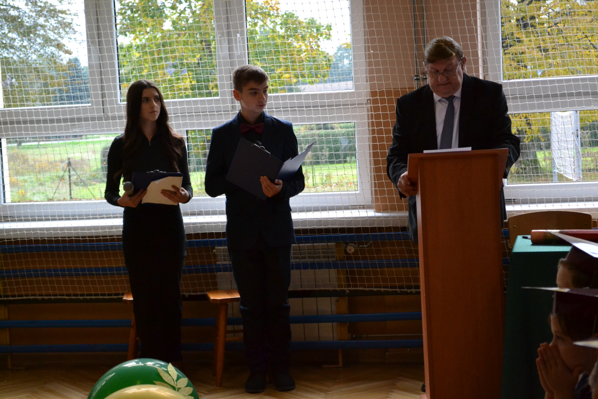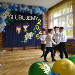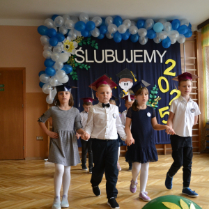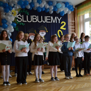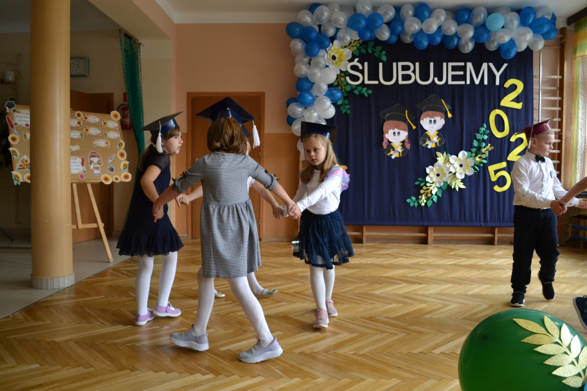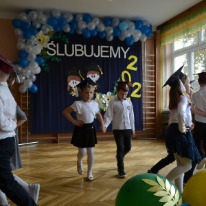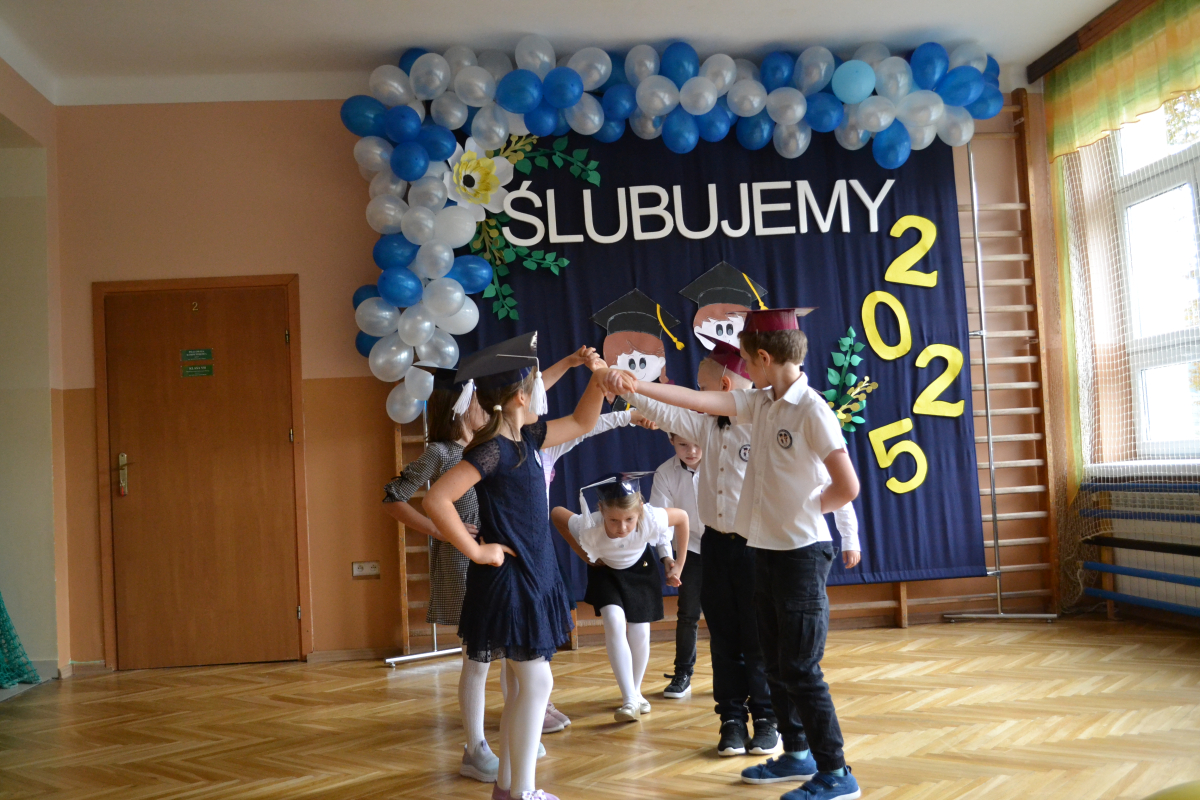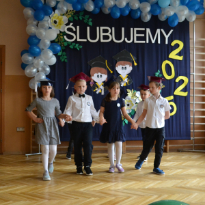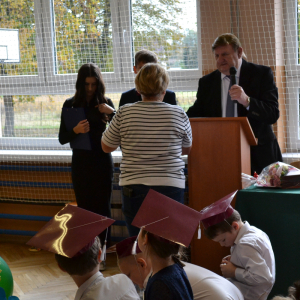 Na zakończenie tej części uroczystości uczniowie klasy I, przy akompaniamencie muzyki, zaprezentowali uroczysty taniec – poloneza, który wzbudził ogromne wzruszenie wśród zgromadzonych rodziców, nauczycieli i gości. Później nastąpiła najbardziej oczekiwana chwila – ślubowanie i pasowanie na ucznia, którego dokonał Pan Dyrektor, Stanisław Pater, używając symbolicznego ołówka.