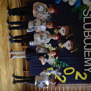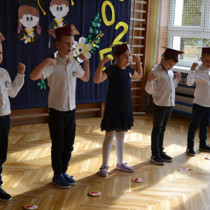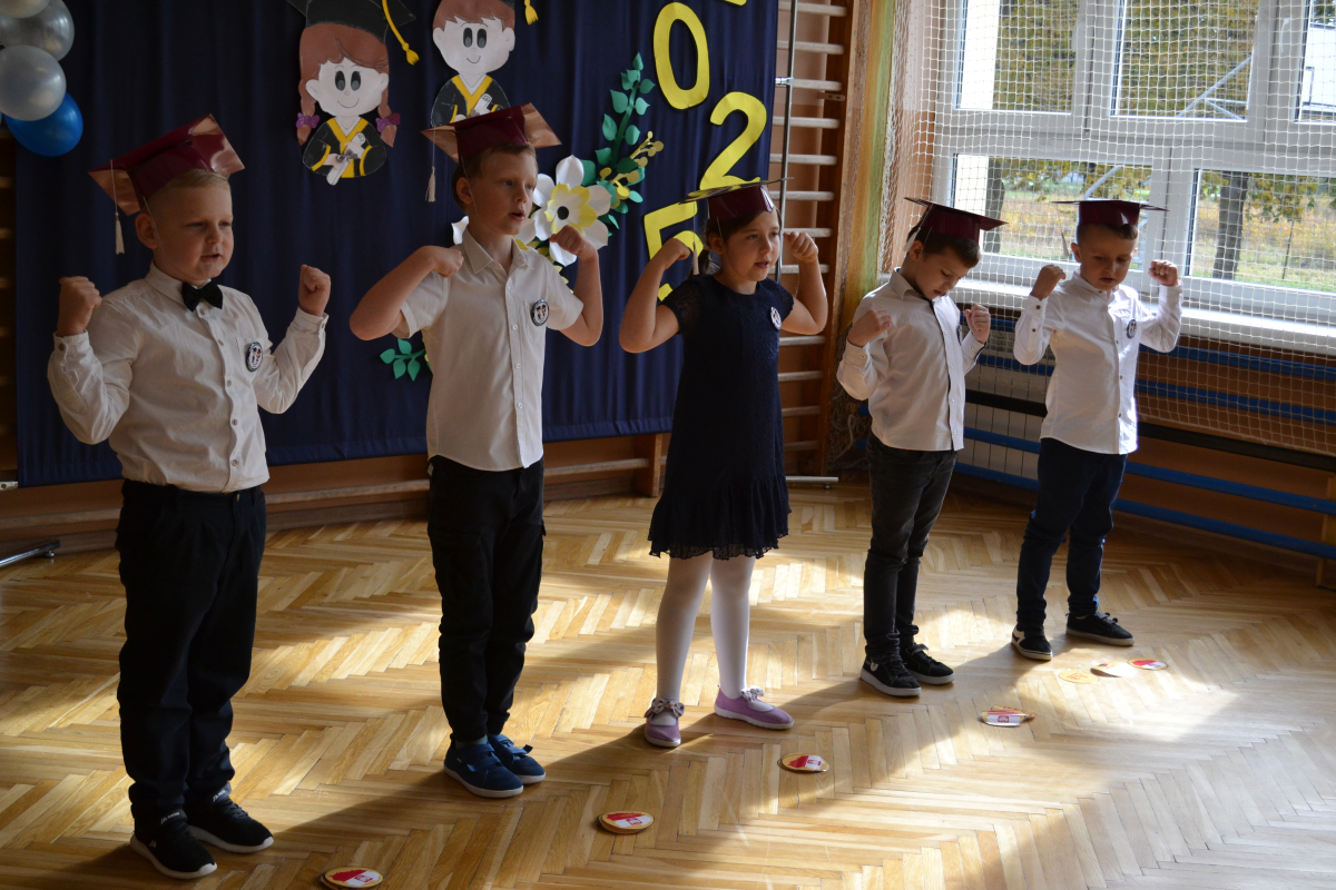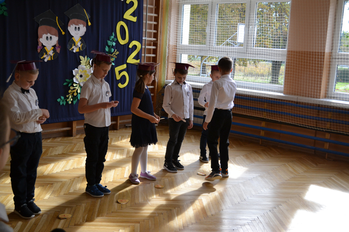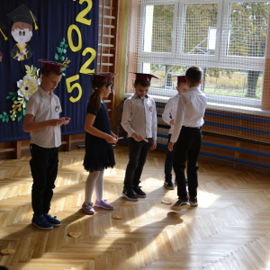 Kolejnym punktem programu był egzamin wiedzy i sprytu, przygotowany przez uczniów klasy II. Pierwszaki musiały zmierzyć się z zagadkami, zadaniami ruchowymi i pytaniami dotyczącymi szkolnych zasad. Oczywiście poradziły sobie śpiewająco! Za każdą sprawnie wykonaną konkurencję pierwszoklasiści otrzymywali symboliczne medale, m.in. za znajomość zasad, odwagę, koleżeńskość i wiedzę.