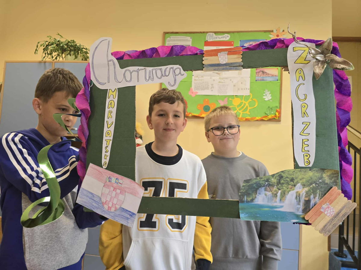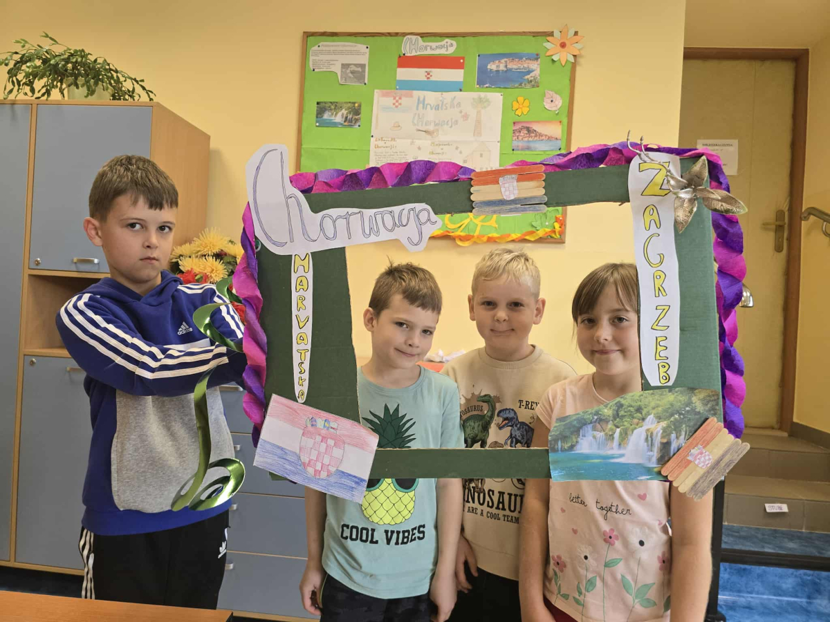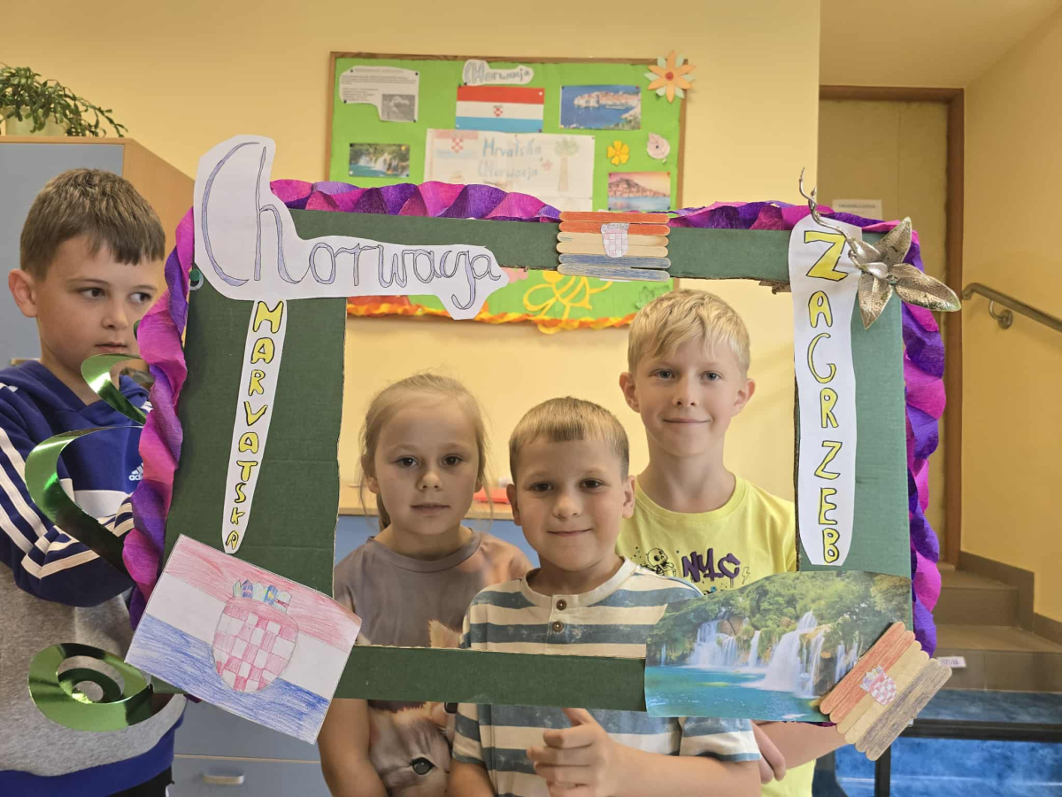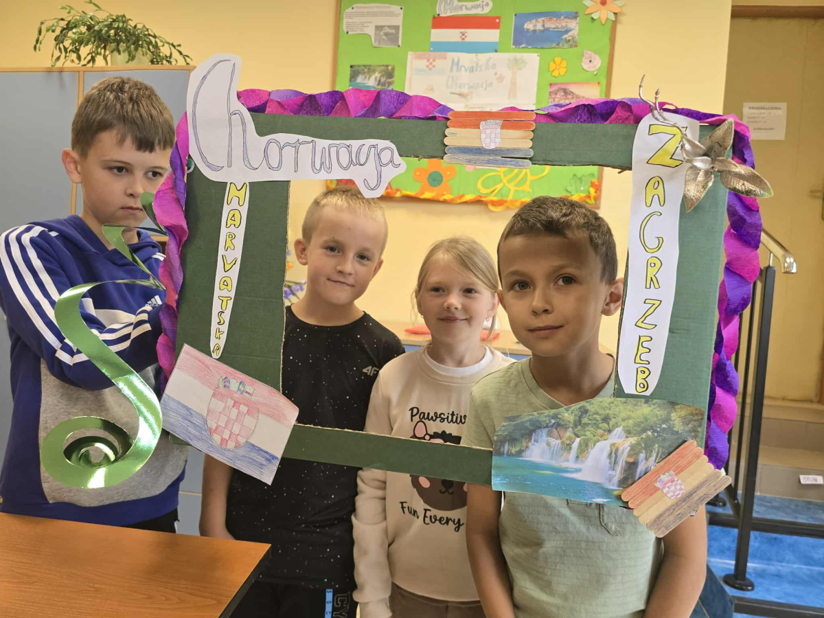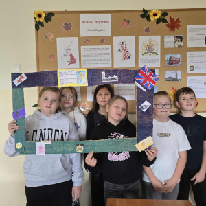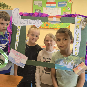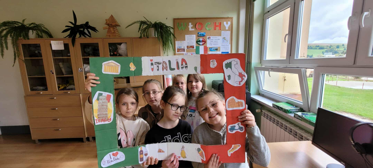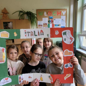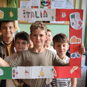 Dnia 6 października w naszej szkole odbyło się rozdanie nagród uczniom klas IV-VIII, którzy wzięli udział w konkursie zorganizowanym przez nauczycieli języków obcych – Panią Małgorzatę Czesak i Panią Klaudię Rąpałę. W związku z obchodami Europejskiego Dnia Języków Obcych, uczniowie klas starszych mieli przygotować dekoracje klasowe oraz ramki do zdjęć związane z wylosowanym przez nich krajem. Dodatkowo, podpisywali przedmioty w klasie w języku danego państwa. Tak oto klasa VII, która zajęła I miejsce w konkursie, pracowała nad dekoracjami dotyczącymi Włoch, klasa IV – druga na podium – zaprezentowała Wielką Brytanię, a klasa V – III miejsce na podium – Chorwację. Pozostałe klasy zapoznały nas z takimi krajami, jak Finlandia oraz Francja. Klasy młodsze natomiast zapoznano z flagami krajów europejskich, a następnie poproszono o namalowanie jednej z nich. Co więcej, uczniowie klas młodszych odbyli w tym dniu „wycieczkę po Europie”. To znaczy, że odwiedzili oni kraje, na temat których dekoracje przygotowali ich starsi koledzy i koleżanki.