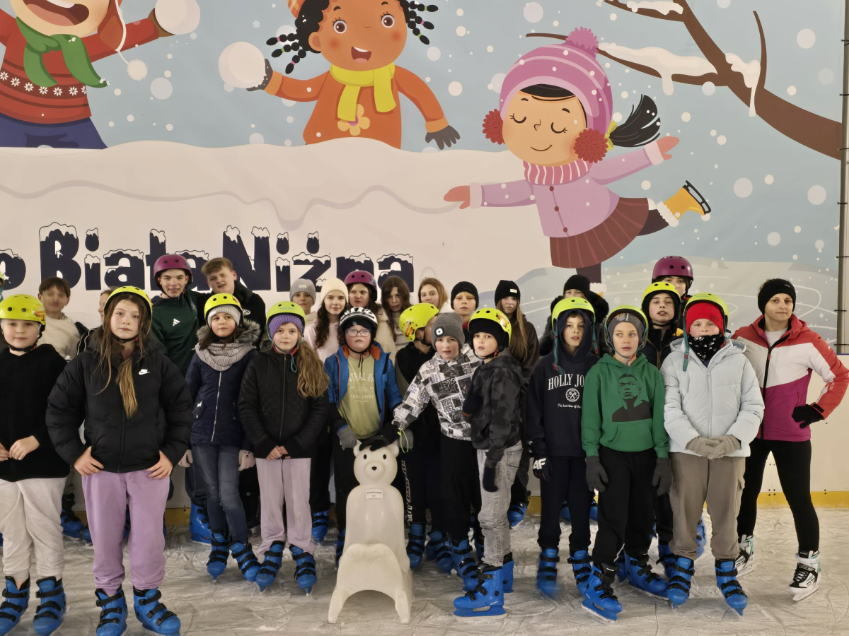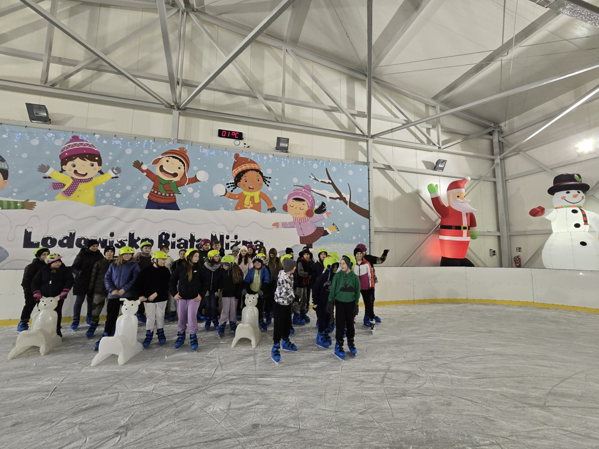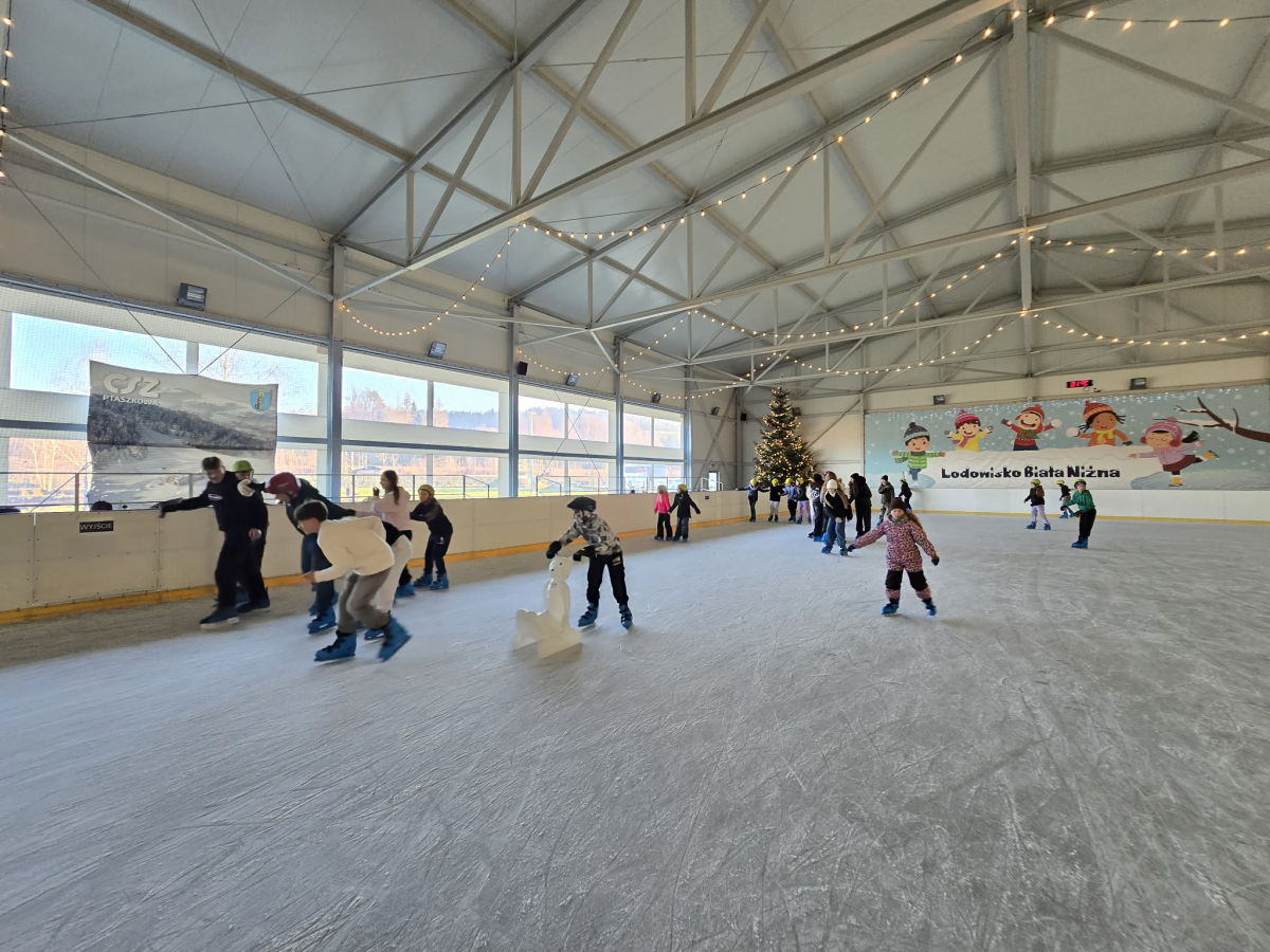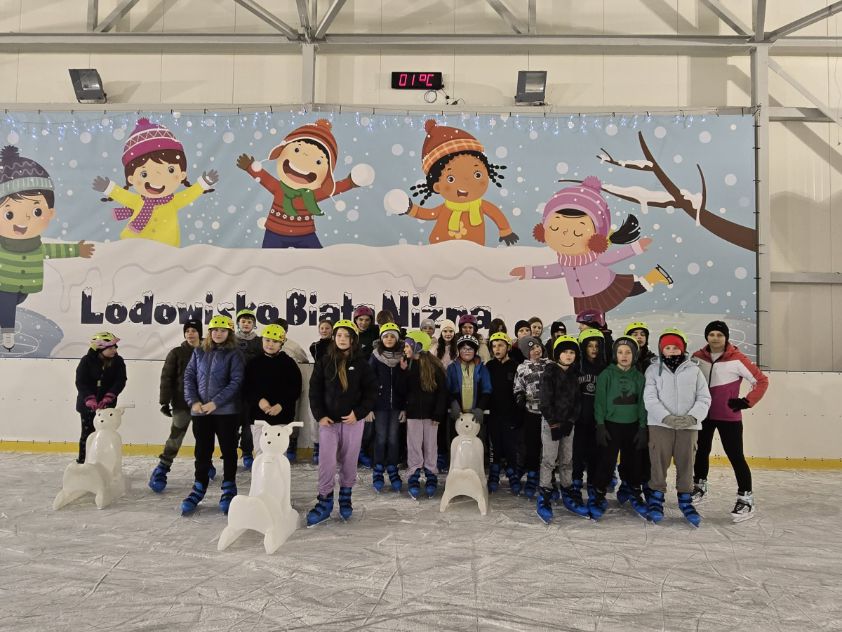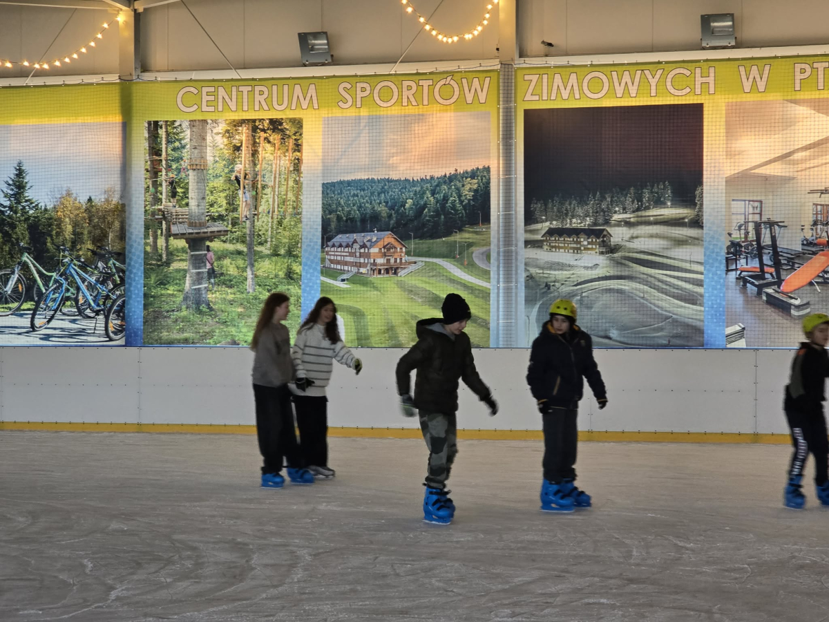 Następnie uczestnicy wycieczki udali się na lodowisko w Białej Niżnej. Jazda na łyżwach sprawiła uczniom wiele radości. Dzieci chętnie pomagały sobie nawzajem, wspierały się i wspólnie uczyły nowych umiejętności, co sprzyjało integracji i budowaniu koleżeńskich relacji.