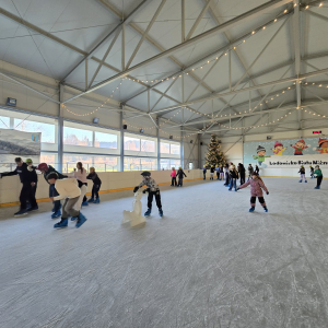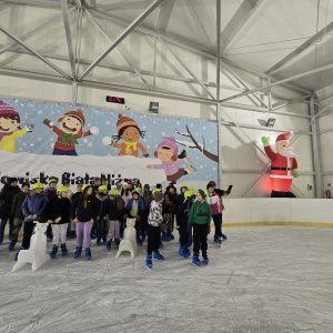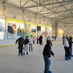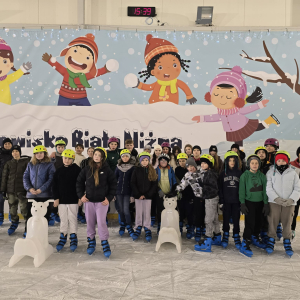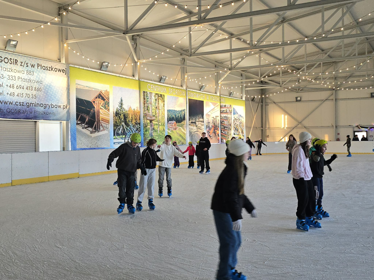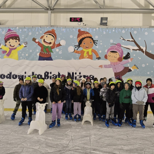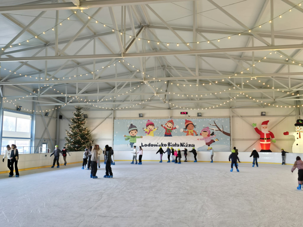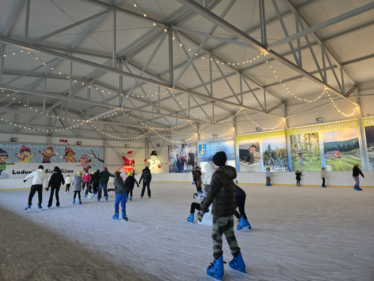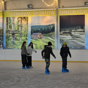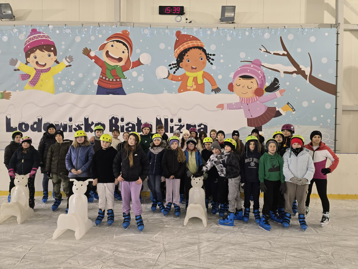 Następnie uczestnicy wycieczki udali się na lodowisko w Białej Niżnej. Jazda na łyżwach sprawiła uczniom wiele radości. Dzieci chętnie pomagały sobie nawzajem, wspierały się i wspólnie uczyły nowych umiejętności, co sprzyjało integracji i budowaniu koleżeńskich relacji.